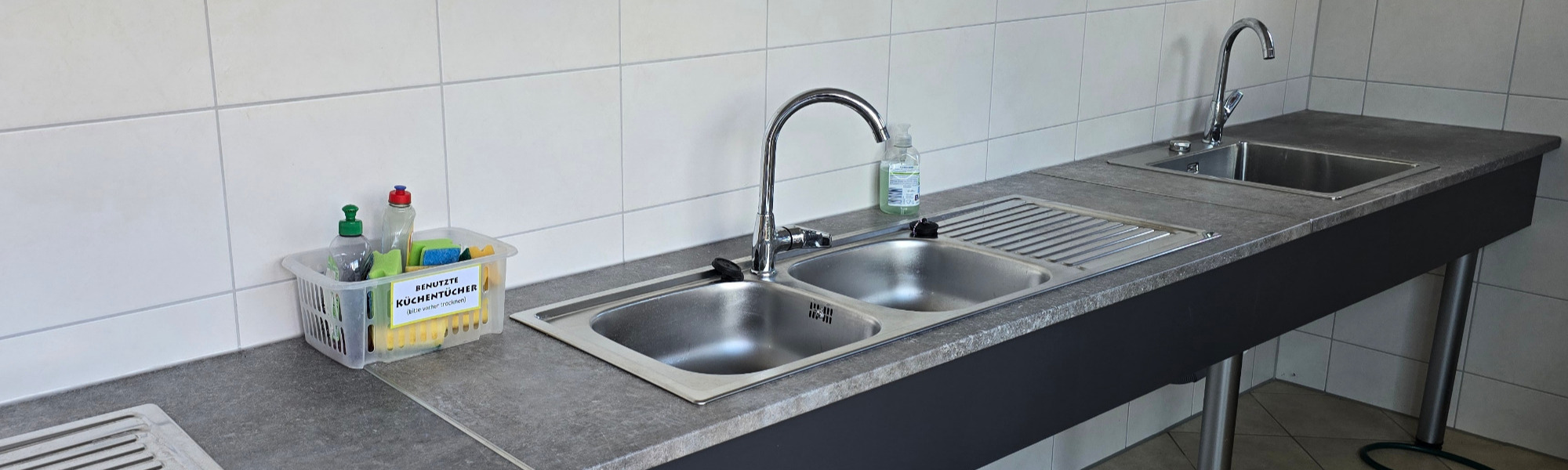 -      Neues Sanitär Gebäude mit Waschräumen, WCs und Duschen, Spülbereich (mit großen Kühlschrank, Wasserkocher und Steckdosen)